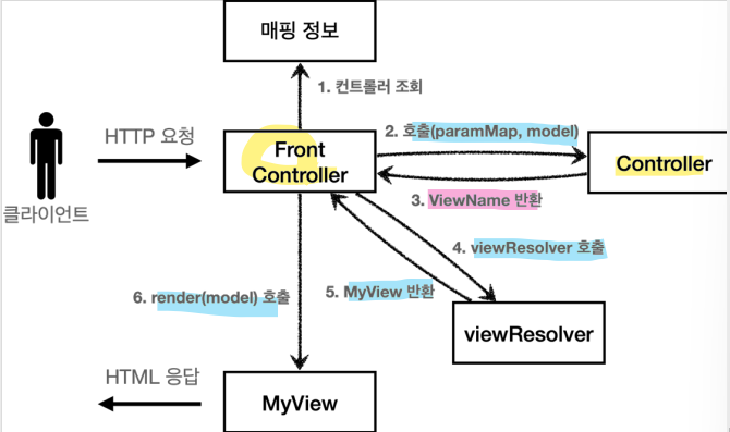 5. 위에서는 .render(mv.getModel()..) 로 모델 객체를 꺼내서 넘겨줬지만 프론트 컨트롤러에서 model을 만들고 관리하기 때문에 view.render(model...) 으로 넘기면 된다.
