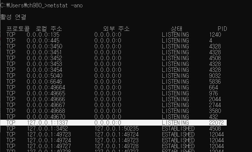 위 사진에서처럼 1337번 포트를 사용하는 프로세스의 ID인 PID 값이 22072임을 확인할 수 있습니다.