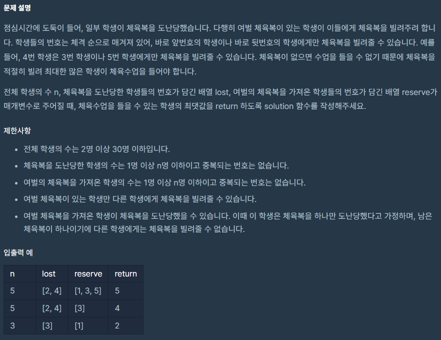 => lost = [1,1,2,3] reserve = [2,2,3,4] 가 될 수 없다. - 여벌의 체육복이 있는 학생(reserve) 도 도난 당했을 수 있다.
