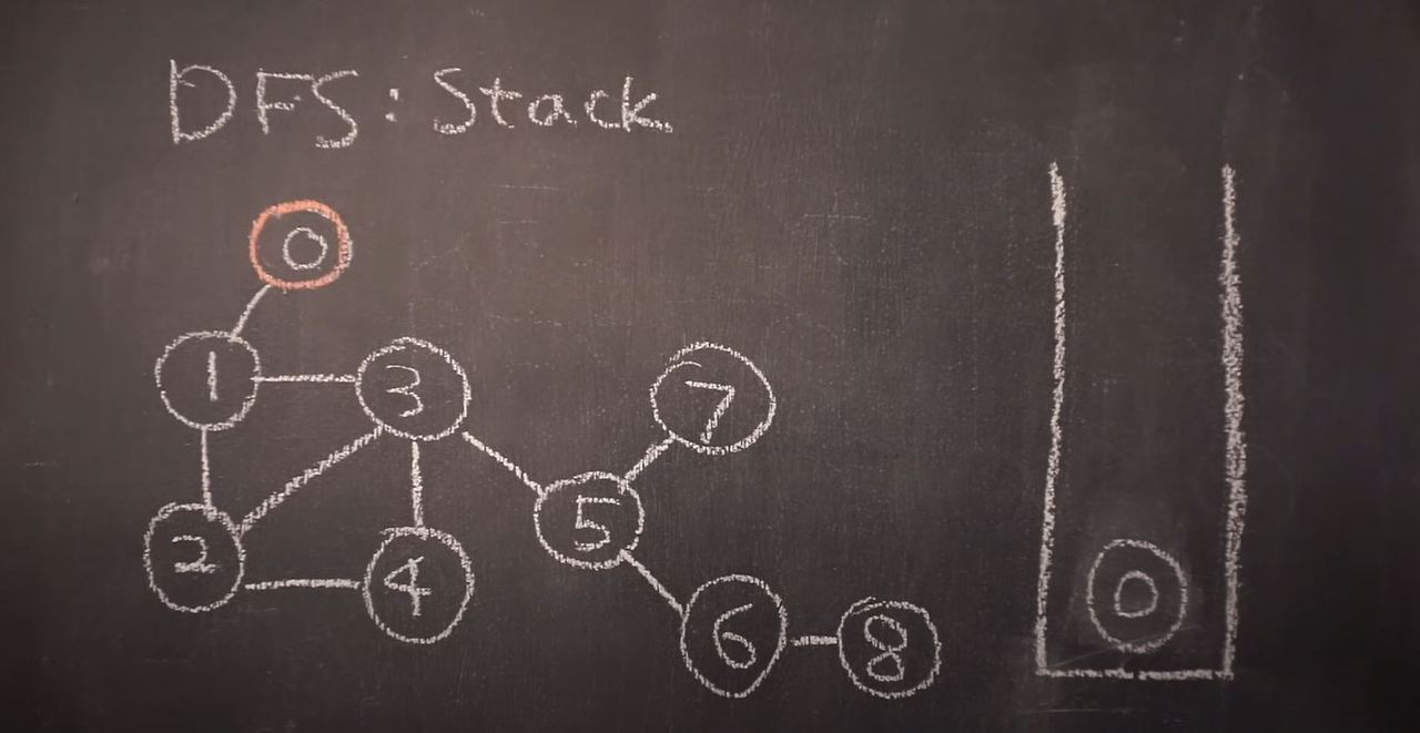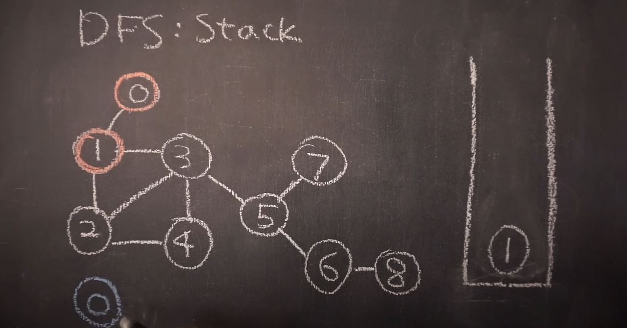 2. 이후 0번 노드를 꺼내 출력하고 그 인접 노드인 1번 노드를 스택에 담았다.