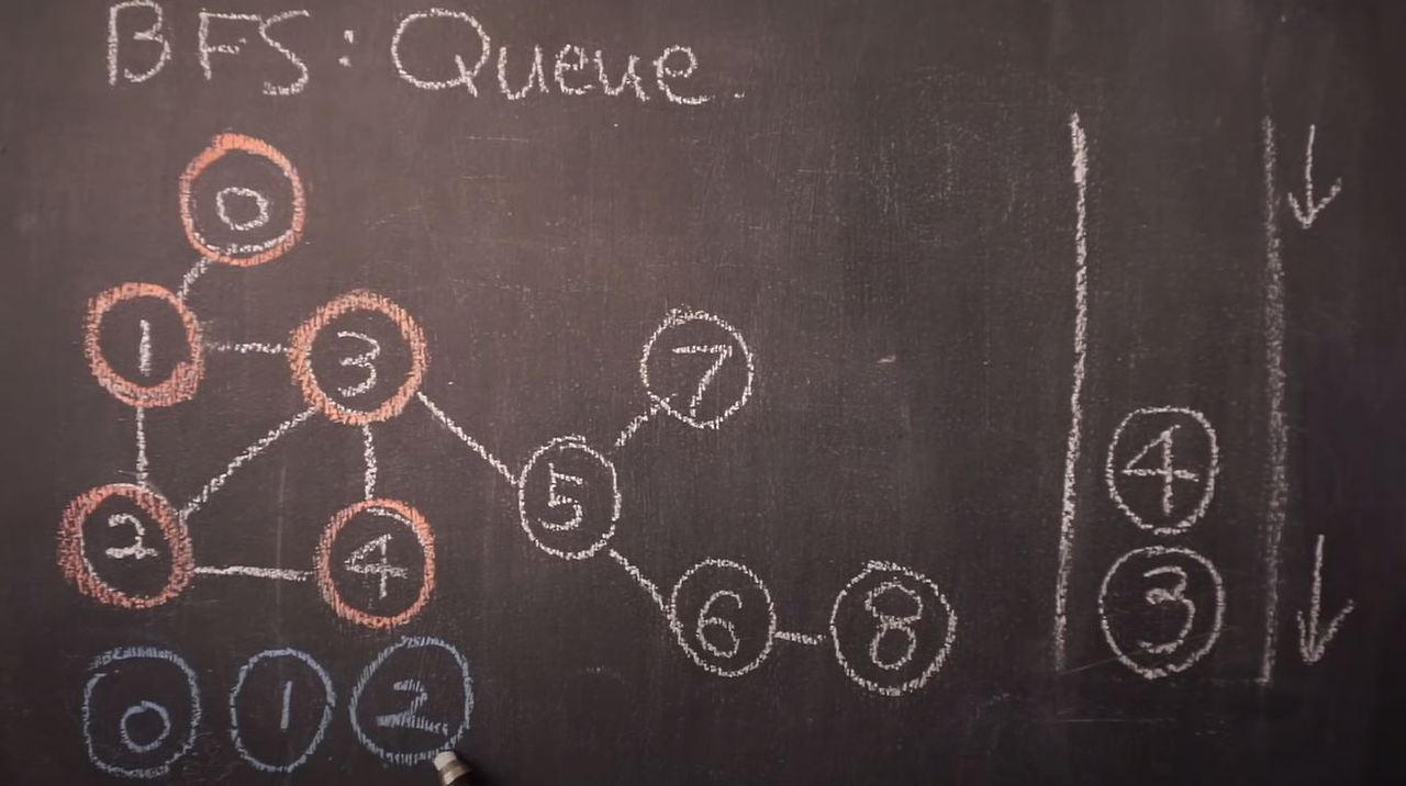 큐는 선입선출 방식이므로 가장 아래 있는 2번 노드부터 꺼낸다. 또한, 그 인접 노드 중 1번, 3번은 이미 큐에 들어갔었으므로 4번 노드만 큐에 담긴다.