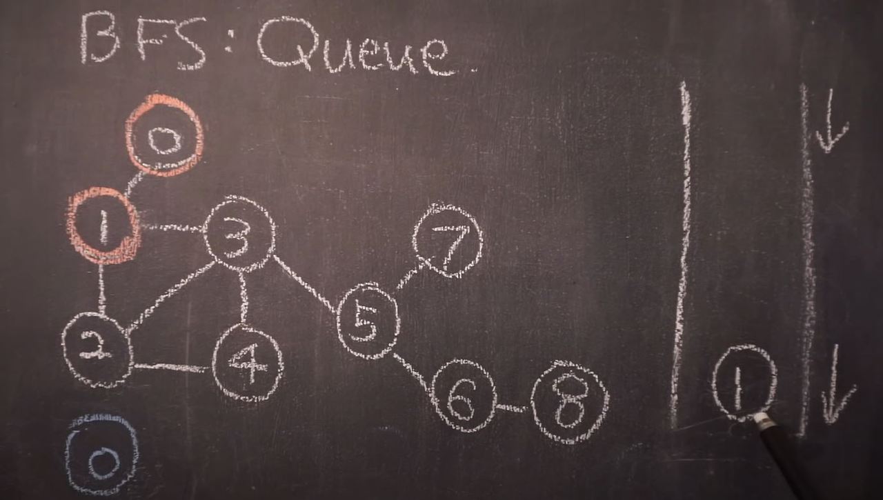 2. 이 후 0번 노드를 꺼내 출력하고, 그 인접 노드인 1번 노드를 큐에 담았다.