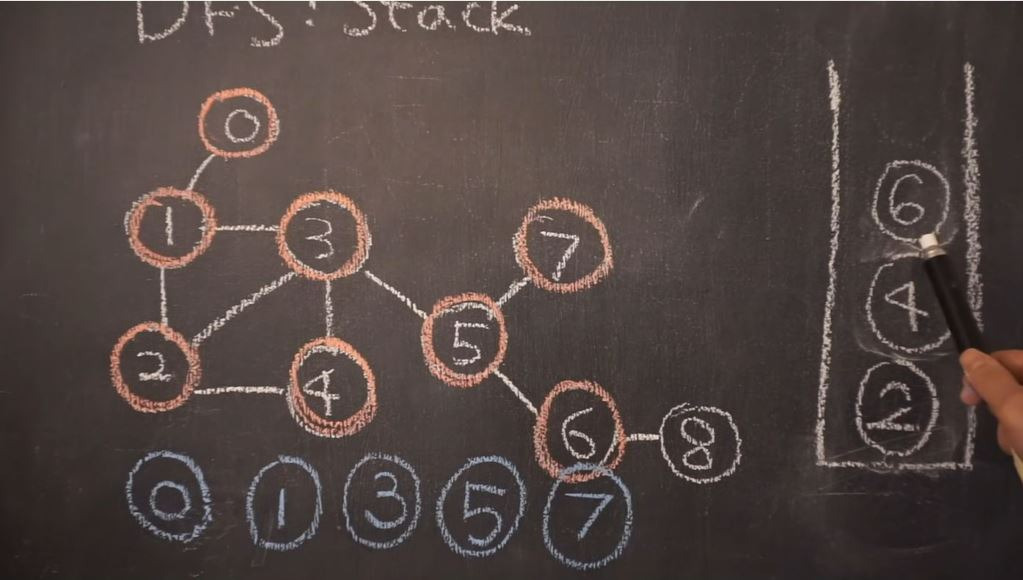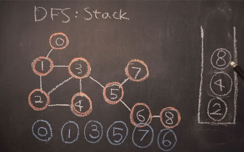 7. 이후 6번 노드를 꺼내 출력하고 그 인접 노드인 8번 노드를 스택에 담았다.