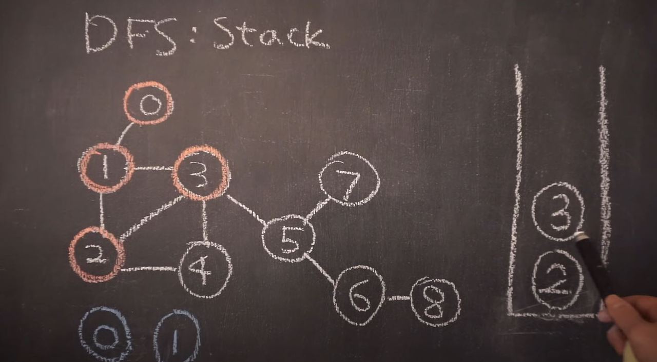 2. 스택의 최상단 노드에 방문하지 않은 인접 노드가 있으면 그 인접 노드를 스택에 넣고 방문 처리를 한다. 방문하지 않은 인접 노드가 없으면 스택에서 최상단 노드를 꺼낸다.