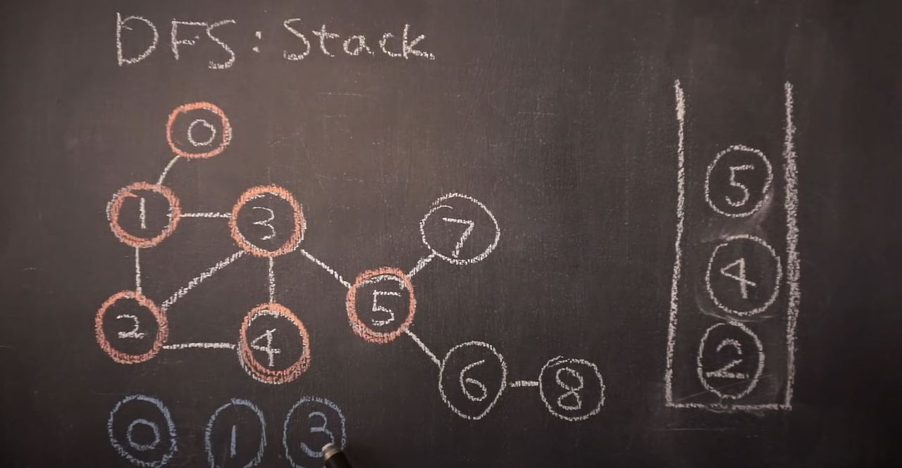 4. 이후 3번 노드를 꺼내 출력하고 그 인접 노드인 4번 노드와 5번 노드를 스택에 담았다. 2번 노드는 이미 스택에 담겨있으므로 스택에 다시 추가하지 않는다.