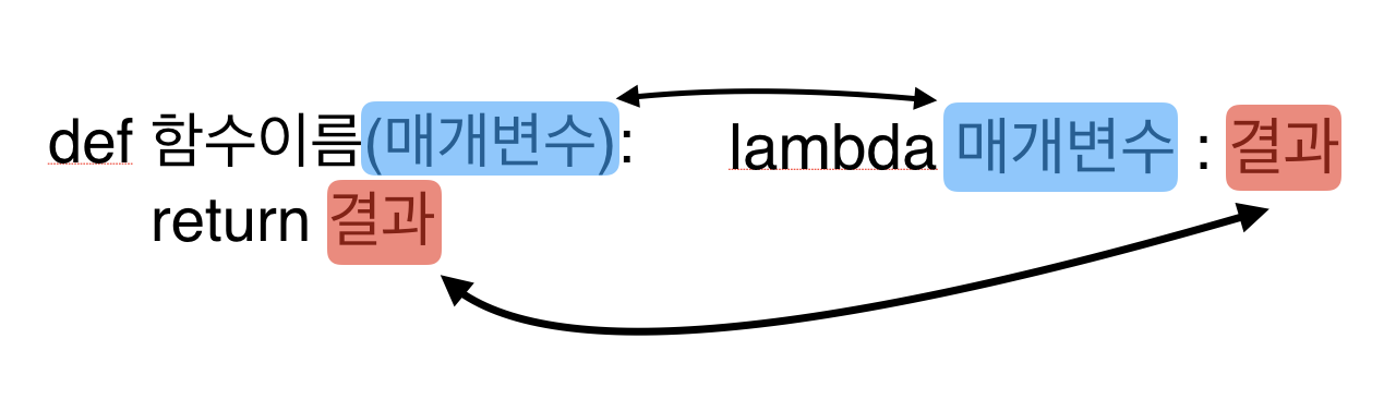 예를 들면 인자로 들어온 값에 2를 곱해서 반환한다고 하면 lambda x : x * 2 이런식으로 됩니다.