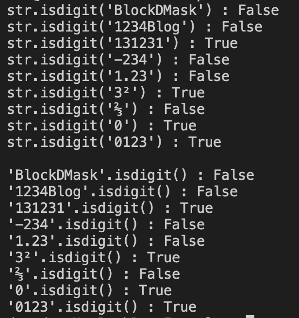 앞서 이야기 드렸듯 "-234" 음수나 "1.23" 과 같은 실수도 False로 반환 하는 것을 알 수 있습니다. -, . 을 문자로 인식했기 때문입니다.